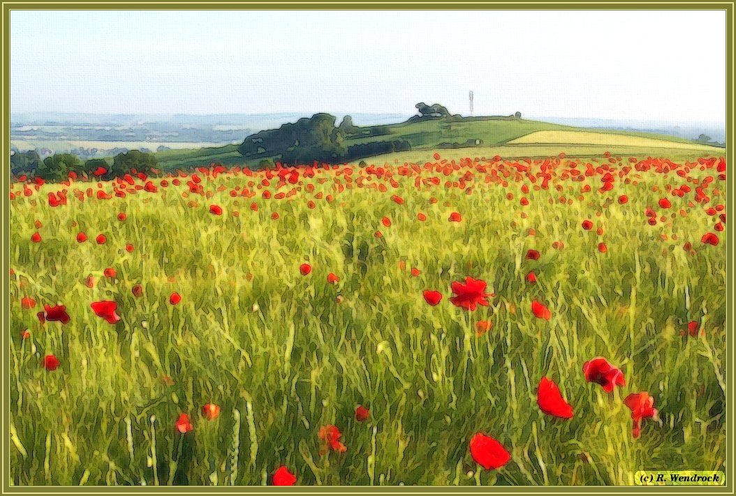 wie mit Wasserfarben gemalt, Klatschmohn in einem Gerstenfeld bei Jahnsdorf