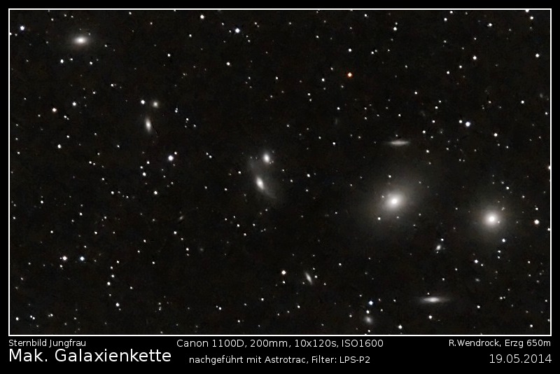 Dieses Bild stellt den zentralen Teil des Virgo-Haufens dar, der sich über die beiden Stermbilder Jungfrau und Haar der Berenike erstreckt. Sämtliche Galaxien, die ich zuordnen konnte, habe ich mit den entprechenden Katalognummern versehen (die Nummern ohne Buchstaben sind dem NGC zuzuordnen). Weitere Galaxien, zu denen ich keine Katalognummern gefunden habe sind einfach nur orange eingekringelt.