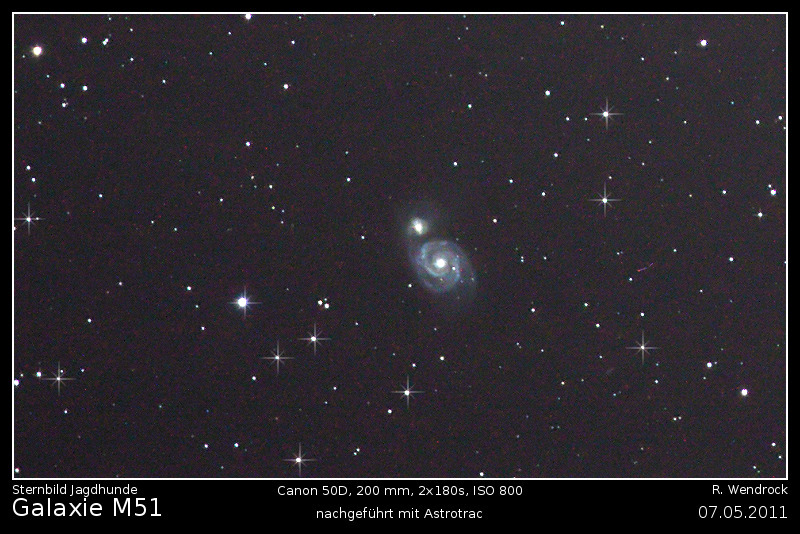 Hier ein zweiter Versuch, diese schöne Galaxie nebst ihrem Begleiter zu fotografieren. Mit einem Tick mehr Brennweite und deutlich längerer Belichtungszeit als beim ersten Versuch.